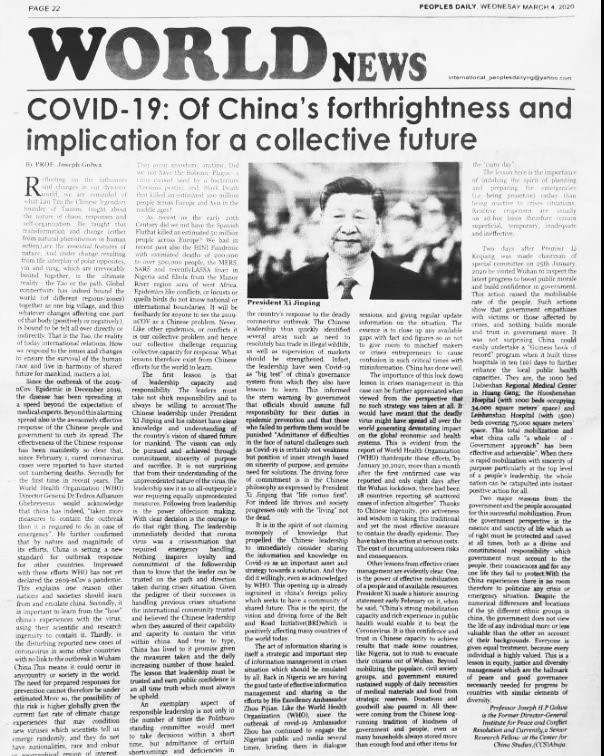 广州双狐签证尼日利亚签证中心了解到,2020年3月4日、5日,尼日利亚和平与冲突解决研究所前所长约瑟夫·戈尔瓦教授在尼主流媒体《人民报》、《蓝图报》、《太阳报》等发表题为《中国抗疫行动坦诚正直对人类共同未来富有启示》的评论文章,高度评价中国为防控新冠肺炎疫情所作努力和牺牲,赞赏中方用实际行动带头践行了构建人类命运共同体思想和共建“一带一路”倡议,呼吁各国学习中国经验,共同抗击疫情。